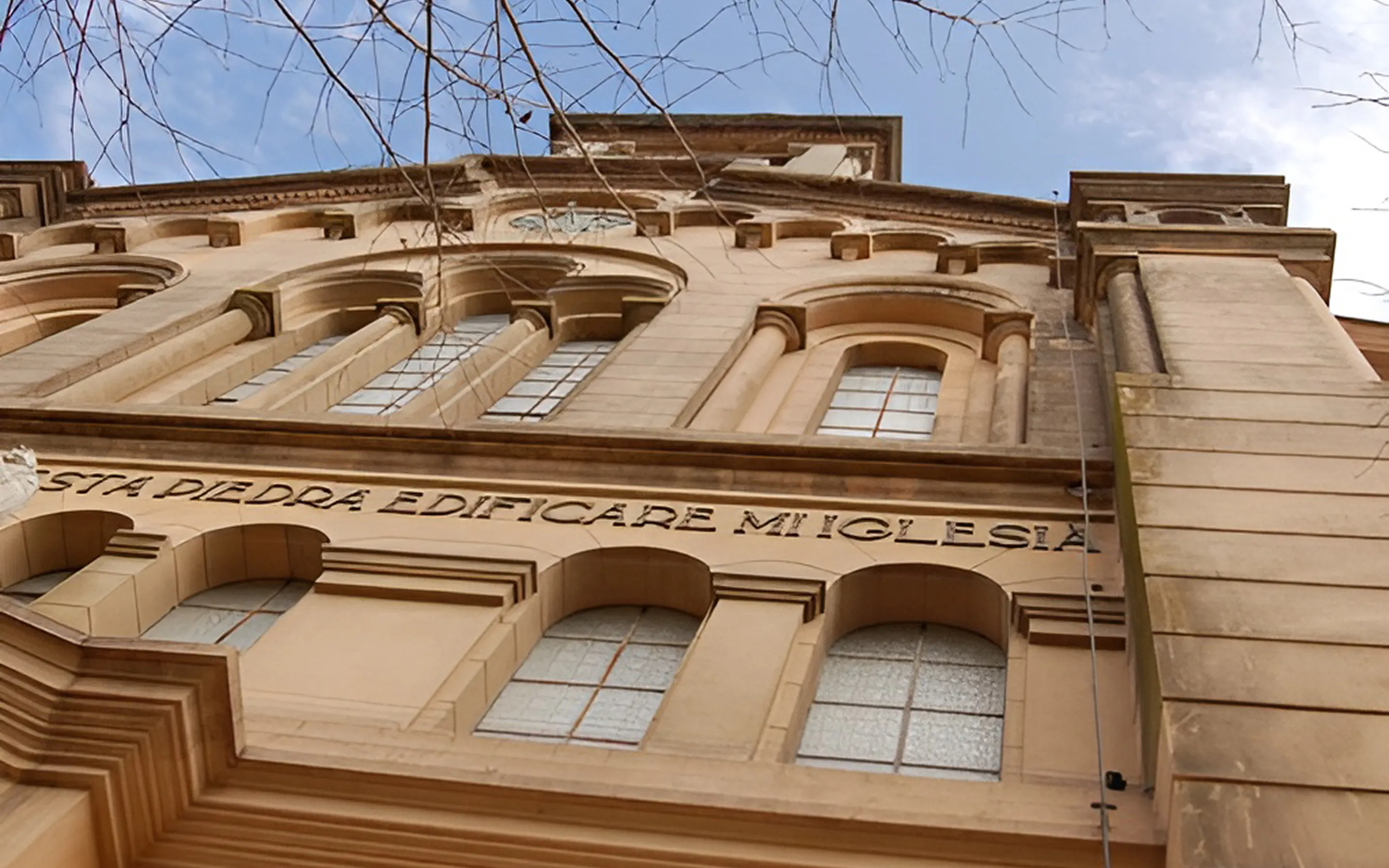 Tras un incendio en el 67 quedando en pie solo la fachada y el pórtico de entrada. El arreglo debía comprender solo la nave y el presbiterio. La fachada existente, y el espacio de la nave, sugerían la solución adoptada. Una iglesia de tipo basilical con dos naves laterales bajas y una nave central. La pared que salva la diferencia de altura entre las naves laterales y la principal, se trató como una gran viga precomprimida, mixta de ladrillo y hormigón.
