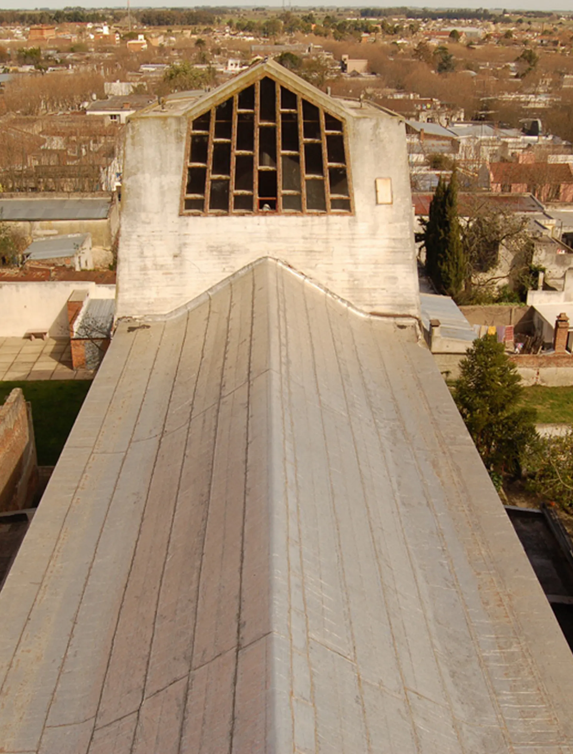 La cubierta de la nave central es una estructura plegada, también precomprimida y de 32 mts de luz y 8 cm de espesor, que apoya en la mampostería de la fachada y en el pórtico de la entrada del presbiterio.